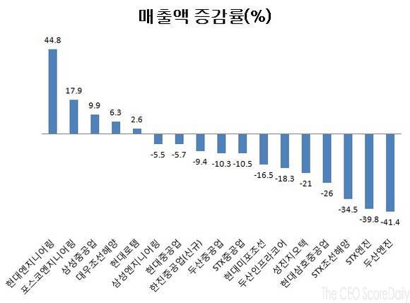 포스코엔지니어링(대표 김수관), 삼성중공업(대표 박대영), 대우조선해양(대표 고재호), 현대로템(대표 한규환)도 매출이 늘었다.