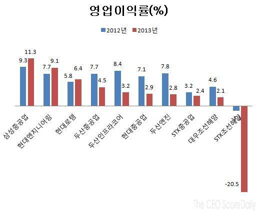이어 현대엔지니어링이 7.7%에서 9.1%로 1.4%포인트 상승했고, 현대로템은 5.8%에서 6.4%로 0.6%포인트 올랐다. 두산중공업이 4.5%, 두산인프라코어가 3.2%, 현대중공업이 2.9%, 두산엔진이 2.8%로 그 뒤를 이었다. 유동성 위기를 겪고 있는 STX그룹의 STX조선해양은 영업이익률은 -20.5%에 달해 꼴찌를 기록했고 STX엔진이 -18.7%, 삼성엔지니어링이 -8.7%를 기록했다.