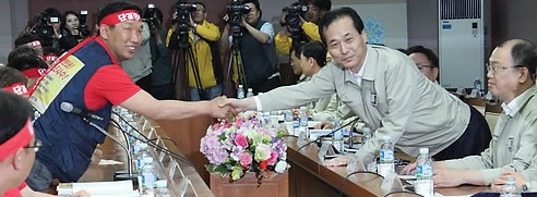 노조의 한 관계자는 “임단협을 본격화하기 전 해고자 복직 문제가 원활하게 해결해야 된다”며 “해고자 복직문제가 임단협과 연계되면 비정규직의 정규화 특별협의와 병행돼야 하는 만큼 교섭이 그만큼 어려워지기 때문”이라고 말했다.(사진은 올해 임금 및 단체협약 교섭을 위한 자리에서 문용문 노조위원장(왼쪽)과 윤갑한 사장이 악수하고 있는 모습.)