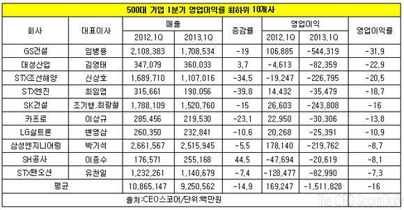 GS건설을 비롯해 수익률 '워스트(Worst) 10'에 포함된 10개사는 올 1분기에 10조8천651억4천700만 원의 매출을 거뒀으나, 매출의 16.3%에 달하는 1조5천1182천800만 원의 영업적자를 냈다. 300개사가 매출의 평균 5.8%에 달하는 영업이익을 기록한 것과 비교하면 참담한 성적이다.