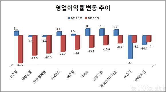[소비자가만드는신문=김문수 기자] 올해 1분기에 최악의 수익률을 올린 업체들이 주로 건설과 조선 관련 업종에 집중돼 있는 것으로 나타났다. 특히 조선경기 침체로 심각한 유동성 위기를 맞고 있는 STX그룹 계열사들이 심각한 영업적자에 빠져 있는 모습이다.