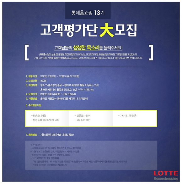 롯데홈쇼핑 제 13기 고객평가단은 오는 7월부터 12월까지 약 6개월간 방송모니터링, 방송품질 설문조사, 마케팅 설문조사 참여, 상품 아이디어 제안, 게시판 참여 등 롯데홈쇼핑의 다양한 분야를 체험하게 된다.
