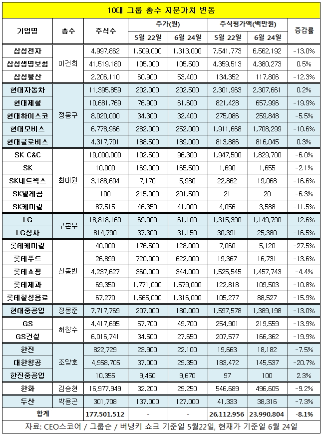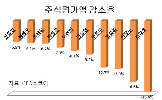 한편 10대 그룹 총수들의 주식평가액 감소율은 평균 8%로 집계됐으며 이중 한진 조양호 회장이 19.4%로 가장 높은 감소율을 기록했다. 허창수 회장이 16.6%, 정몽준 회장이 13%, 구본무 회장이 12.7%, 김승연 회장이 9.2%, 이건희 회장이 8.1%로 그 뒤를 이었다.