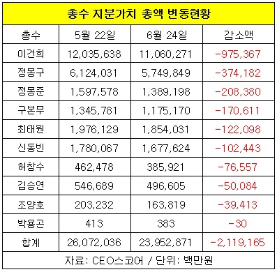 이 밖에 롯데그룹 신동빈 회장은 롯데케미칼과 롯데칠성 등 보유한 자사주 5개 모두 하락하며 지분가치가 1천24억 원 줄었다.