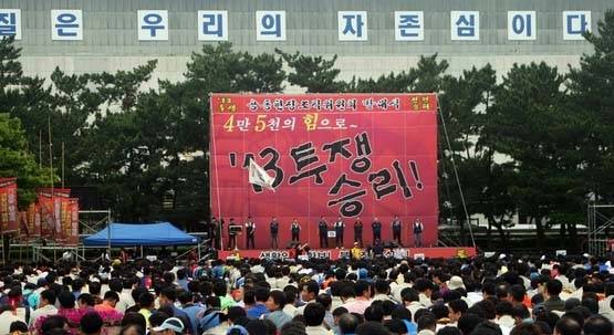 정규·비정규직 조합원 5천여 명이 참여한 가운데 문용문 위원장은 "노조가 어려운 정세 속에서도 투쟁에 나서는 것은 땀 흘려 일한 노동의 존엄성과 정의를 바로 세우기 위함"이라며 "이번 임단투 출정식을 통해 4만5천여 조합원이 흘린 피와 땀에 대한 분배의 정의를 반드시 실현하겠다"고 밝혔다.