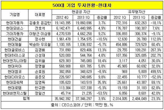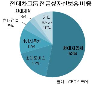 한편, 올 1분기 현금 및 현금성 자산과 단기금융상품 보유액은 37조3천462억 원으로 전년 동기 35조9천423억 원보다 3.9% 늘어났다. 이는 주력사인 현대차와 현대모비스, 기아차에 대부분 몰려 있는 것으로 나타나 투자보다는 현금을 쌓는데 집중한 것으로 보인다.