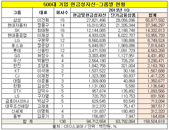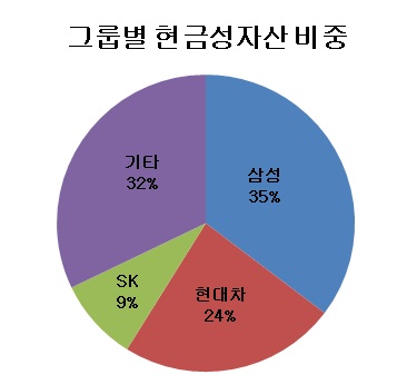 그룹별 현금사정에서는 재계 1위인 삼성그룹(회장 이건희)과 2위인 현대자동차그룹(회장 정몽구)가 압도적인 격차로 1, 2위를 차지했다.