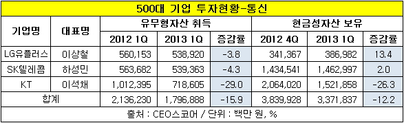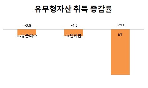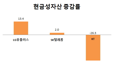 현금성자산의 경우 KT는 26.3%, 5천억 원 이상 감소한 반면 SK텔레콤과 LG유플러스는 증가했다.