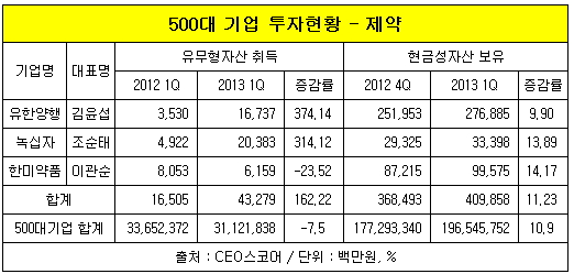 국내 500대 기업 중 1분기보고서를 공시한 302개 업체의 유무형자산 취득액이 7.5% 감소하고, 현금성 자산은 10.9% 증가한 것과 대조된다.