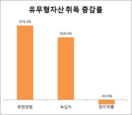유한양행과 녹십자의 경우 설비투자를 보여주는 유무형자산 취득액이 300% 이상 증가한 반면, 한미약품은 20%대의 감소율을 보였다.