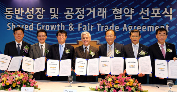회사측은 27일 쉐보레 부평중앙대리점에서 5개 딜러 및 한국지엠 전국대리점연합회(이하 연합회) 등 판매부문 사업 파트너들과 공정거래 및 동반성장 협약을 맺고 국내 판매 증진을 위한 결의를 다졌다고 밝혔다.