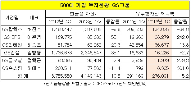 국내 500대 기업 가운데 올 1분기 실적을 발표한 GS그룹 6개 계열사가 현금성 자산을 두자릿수 증가율로 늘린 반면, 설비투자지표인 유무형자산 취득액은 줄였기 때문이다.