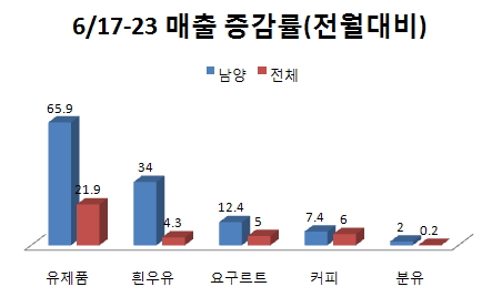 매출이 가장 많이 증가한 품목은 유제품으로 17일부터 23일까지 매출이 전달 같은 기간에 비해 65.9%나 증가했다. 해당 대형마트의 유제품 전체 매출증가율 21.9%를 3배 이상 상회하는 수치다.