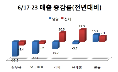 17일부터 23일까지 흰우유매출은 지난해 같은 기간에 비해 33.3%나 줄어 A대형마트 전체 희우유매출감소율(8.4%)의 4배 이상을 기록했다.
