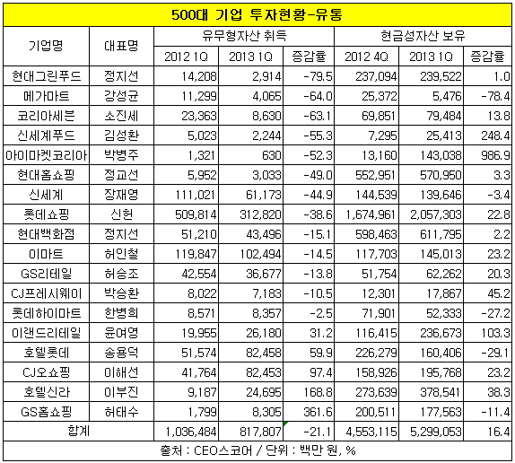 이는 지난해 같은 기간에 비해 21.1%나 감소한 수치다. 500대 기업 평균치인 13.4%보다 7.7%포인트나 높을 정도로 유통업체들이 투자에 몸을 사리고 있다.
