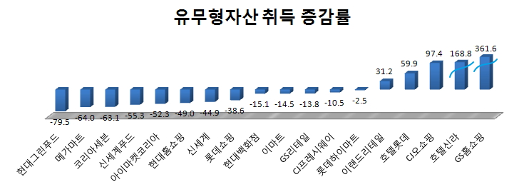 특히 대형마트 영업규제와 골목상권 규제로 타격을 받은 식자재유통 업체와 대형마트, 편의점 11개사는 유무형자산 취득액이 일제히 감소했다.
