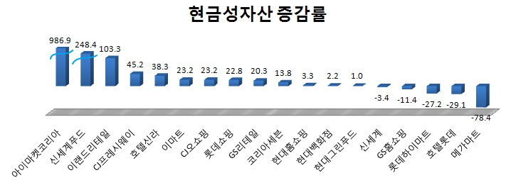 이어 신세계푸드(248.4%), 이랜드리테일(103.3%), CJ프레시웨이(45.2%), 호텔신라(38.3%), 이마트(23.2%), CJ오쇼핑(23.2%), 롯데쇼핑(22.8%), GS리테일(20.3%), 코리아세븐(13.8%)이 현금성 자산을 크게 늘렸다.