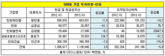 현금 축적에 힘쓰면서 설비투자는 소극적으로 한 셈이다. 5개사 가운데 2개사가 투자를 줄였고 나머지 3개사는 늘렸지만 주력 계열사인 한화케미칼(대표 방한홍)이 유무형자산 취득을 줄인 것이 전체 투자규모를 감소시켰다.