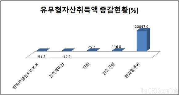 반면, ㈜한화(대표 심경섭)는 유무형자산취득액이 전년보다 75.7%나 늘었다. 또 한화건설(대표 이근포)과 한화엘앤씨(대표 김창범)도 116.8%, 20847.9%에 달하는 높은 증가율을 기록했다.