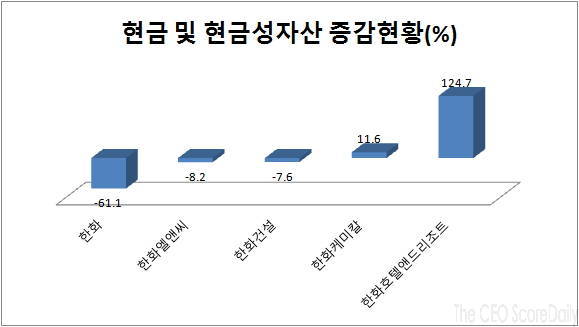 반대로 투자가 늘어난 한화와 한화건설, 한화엘앤씨는 현금성 자산이 감소했다. 한화는 현금성자산이 전년말 대비 61.1% 감소했고, 한화엘앤씨는 8.2%, 한화건설은 7.6% 줄었다.