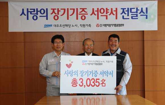 대우조선해양 정성대 총무팀장(상무)은 “장기기증 서약은 가장 간단하지만 결심이 쉽지 않은 일”이라며 “회사는 장기기증은 곧 ‘세상을 떠날 때 나눌 수 있는 마지막 축복’이라는 인식을 확산시키기 위해 지속적으로 장기기증 캠페인을 전개할 것”이라고 말했다.