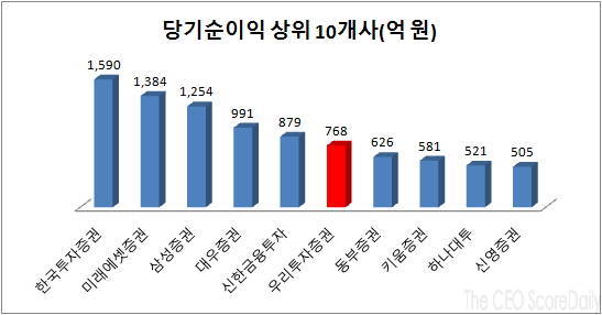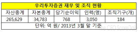 우리투자증권은 올해 3월 말 현재 자산이 총 26조5천630억원으로 대우증권(25조412억원)과 한국투자증권(19조2천732억 원)을 앞선 업계 1위다. 국내지점 및 해외사업부는 184개로 현대증권, 삼성증권, 대우증권, 동양증권에 이어 5위다.