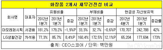 30일 재벌 및 CEO, 기업 경영성과 평가사이트인 CEO스코어(대표 박주근)가 두 회사의 재무구조를 비교한 결과, 아모레퍼시픽은 LG생활건강에 비해 유동비율은 2배가 넘고 부채비율은 5분의 1도 안 되는 것으로 나타났다.