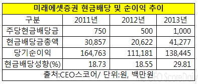 자본규모가 비교적 적은 증권사들도 현금배당 규모가 크지 않다. 자본총계 1조3천억 원 수준인 동양증권(대표 정진석)은 보통주 1주당 50원의 결산배당을 결정했으며, 자본총계 1조6천억 원 수준인 대신증권(대표 나재철) 또한 보통주 1주당 500원의 배당을 결의했다. 이에 따라 자본규모 2조1천억 원 수준인 미래에셋증권이 주당 1천 원이나 배당하기로 한 것은 다른 증권사들과 비교해 지나치게 높다는 지적이다.