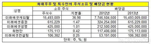 이 같은 배당 결정으로 미래에셋증권의 대주주들은 작년보다 2배 오른 수준의 배당금을 받게됐다. 미래에셋증권의 최대주주인 미래에셋캐피탈은 1천549만3천9주(36.98%)를 소유하고 있는 가운데 배당금 총액이 지난해 77억 원에서 올해 154억 원으로 100% 급증했다. 미래에셋캐피탈의 최대주주는 박현주 미래에셋 그룹회장이다. 지분 48.7%를 보유하고 있다.
