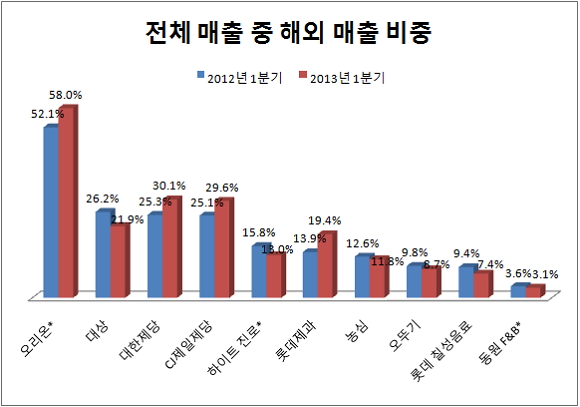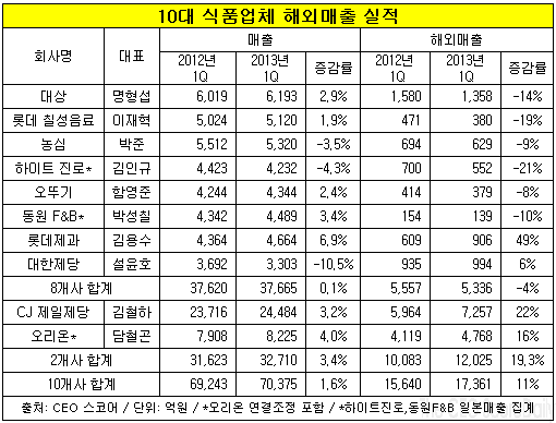 국내 10대 식품업체 가운데 이미 해외시장에서 성공적으로 자리를 잡은 CJ제일제당과 오리온이 성장세를 이어가고 있는 반면, 다른 기업들은 대체로 부진을 보이고 있기 때문이다.