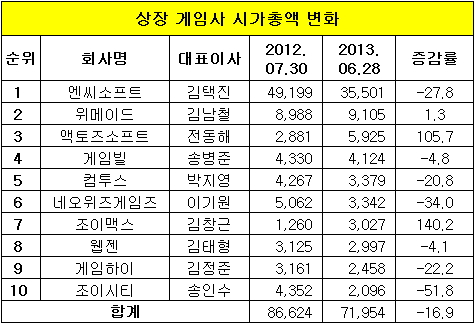 1일 금융감독원과 관련 업계에 따르면 10대 상장 게임사의 시가총액이 지난 28일 7조1천954억 원을 기록해 지난해 7월과 비교해 16.9% 감소한 것으로 집계됐다. 애니팡의 대히트 이후 모바일 게임 시장이 폭발적으로 성장해 게임사들의 매출이 급성장한 것과는 사뭇 다른 결과다.