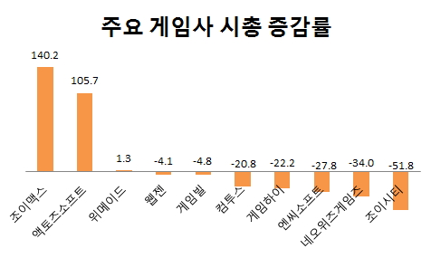10개 게임사 가운데 7개사의 시가총액이 감소한 반면, 증가한 곳은 단 3곳에 불과했다. 이번 조사에서는 매출 규모가 업계 3위와 4위이지만 게임사업부가 분리되지 않은 NHN한게임(대표 이은상)과 CJ E&M넷마블(대표 조영기)이 제외됐다.