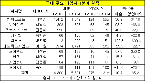 10개 게임사는 지난 1분기에 매출은 전년 동기 대비 10.4%, 영업이익은 35.2%나 증가하는 호성적을 냈다.