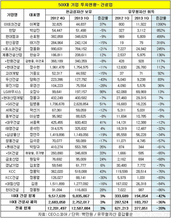 또 현금성 자산이 증가한 곳도 10대 건설사 중 GS건설과 대우건설, 롯데건설, SK건설 뿐이었다. 10대 건설사의 올 1분기 유무형자산 취득액은 지난해 1분기보다 42%가 감소한 데 비해 이들을 제외한 나머지 건설사는 36%가 줄었다.