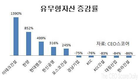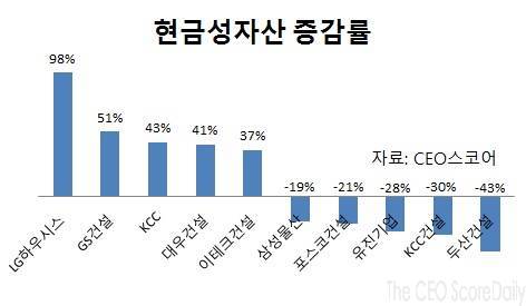 중동에서 5천억 원대의 손실을 입은 GS건설은 현금성 자산이 51% 증가했고, KCC가 43%, 대우건설(대표 서종욱)이 41%, 이테크건설이 37%, 롯데건설이 35%, SK건설이 33%를 기록했다.
