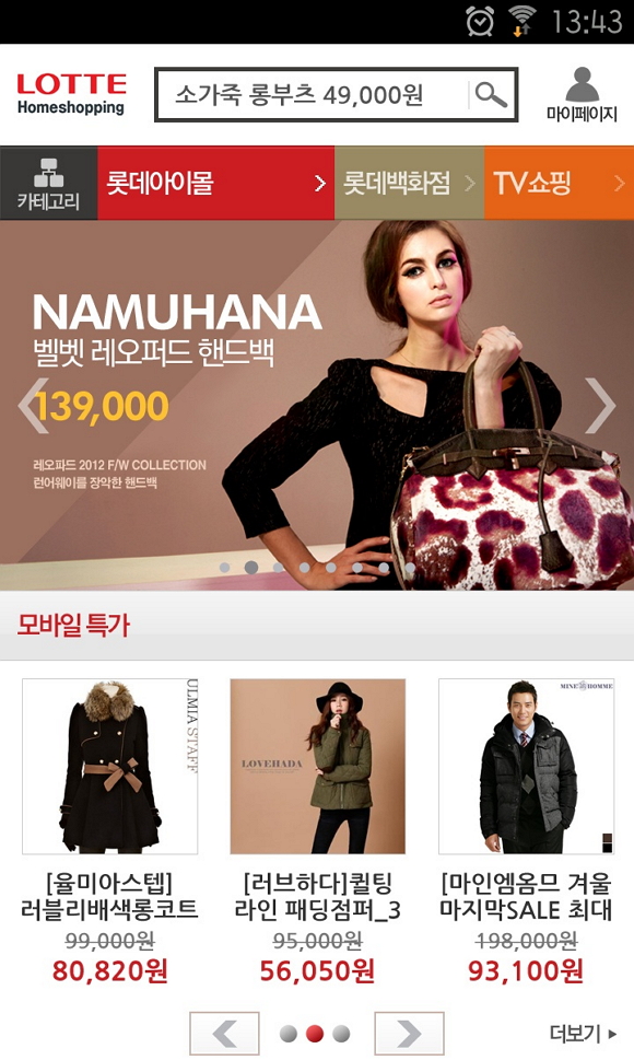 롯데홈쇼핑은 '모바일 롯데홈쇼핑'의 메인페이지에 사용률이 높은 아이콘을 우선배치하고 기존 작은 상품 이미지를 스마트폰환경에 맞게 최적화해 불편함을 최소화 했다.