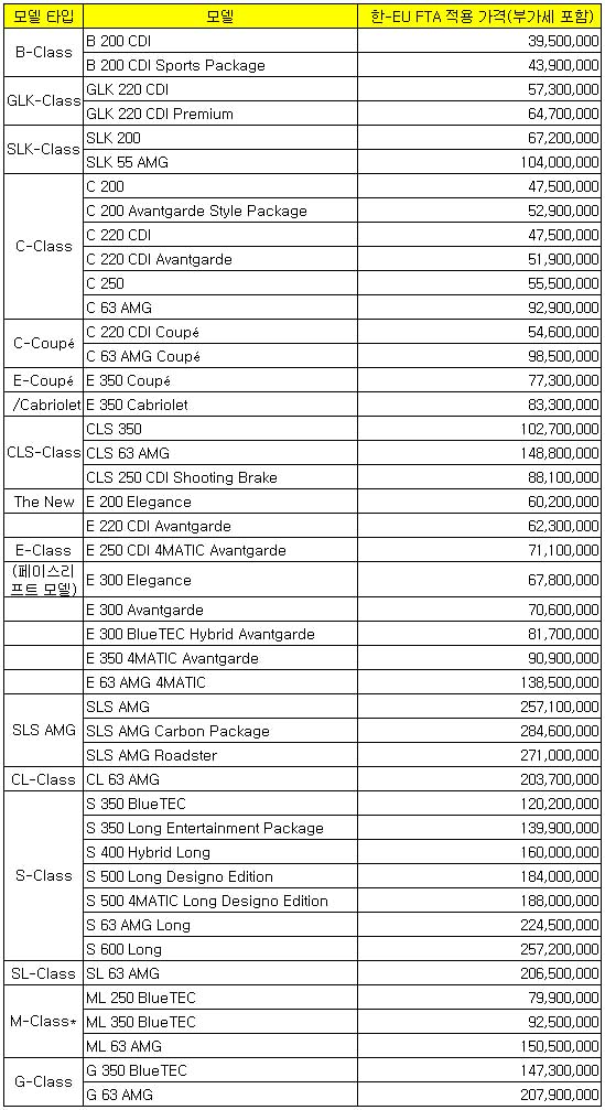 URL복사 기사공유하기 스크랩 프린트 메일보내기 글씨키우기 메르세데스벤츠코리아(대표 이보마울 김성기)가 7월부터 자동차 판매 가격을 최대 340만원까지 내린다. 회사측은 3차 한-EU FTA 관세 인하를 적용해 차종에 따라 30만원에서 340만원까지 판매 가격을 인하키로 했다고 1일 밝혔다. 또 지난달 24일에 출시한 E-Class 페이스리프트 모델 ‘The New E-Class’에 이를 선적용하기로 했다. 아래는 관세 인하를 적용한 차종별 가격이다. 자료 = 메르세데스벤츠코리아 제공 저작권자 © 소비자가 만드는 신문 무단전재 및 재배포 금지 김종혁 기자 다른기사 보기 URL복사 기사공유하기 주요기사 OK저축은행, 올해 순이익 3.5배 급증하며 1위 SBI저축은행 맹추격 김동연 지사, 안성 거점소독시설에서 초동 방역 상황 점검..."빠른 대응·강력한 방역·신속 지원 3대 원칙으로 대응" 동아쏘시오그룹, 창립 93주년 기념식 개최...44년 만에 신규 CI 공개 김동연 지사, "안성 동신일반산업단지 잘 될 수 있도록 최선" 깨끗한나라, 오너 3세 최현수 회장 취임...미래 100년 위한 의사결정 체계 강화 [인사] SPC그룹