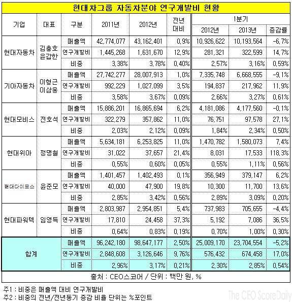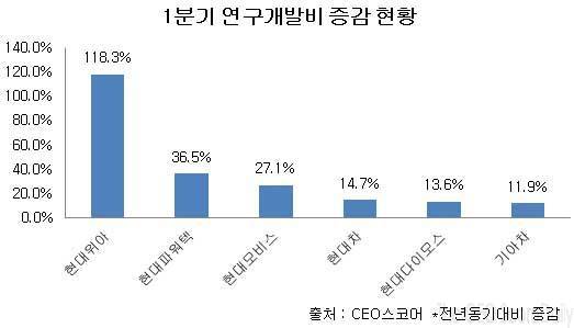 이밖에 현대모비스(대표 전호석)은 연구개발비를 27.1%, 현대다이모스(대표 윤준모)와 현대파워텍(대표 임영득)도 13.6%, 36.5% 늘렸다.
