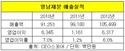 영남제분은 최근 3년간 매출이 증가하고 영업흑자를 내는 등 비교적 안정된 실적을 내고 있지만 매출이 1천억 원 안팎에서 더디게 늘고 있으며 영업이익률도 1%에서 7%대를 오가는 데 그치고 있다.