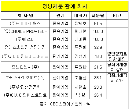 의료기기 제조업체인 케이아이웍스(대표 장세호)와 베트남에 소재를 둔 보호용 테이프 생산업체 초이스프로텍(CHOICE PRO TECH, 대표 최대현)과 수입차 판매를 하는 에쓰비(대표 배비용), 양계사업을 하는 영농조합법인 청림농장(대표 류원하)을 설립하거나 인수해 종속회사로 거느리고 있다.