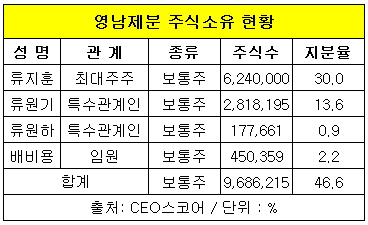 영남제분은 류원기 회장과 류 회장의 장남 류지훈 부사장, 류 회장의 동생인 류원하 청림농장 대표 등이 44%의 지분율로 회사를 직접 이끄는 가족경영을 펼치고 있다.