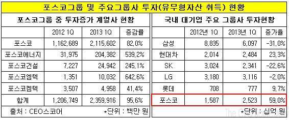 포스코를 포함한 포스코그룹 11개 회사의 1분기 유무형 자산 취득금액(투자금액)은 2조5천234억 원으로 지난해 같은 기간보다 무려 59%나 급증했다. 본업인 철강을 중심으로 에너지, 건설 등에 적극적인 투자에 나선 결과다.