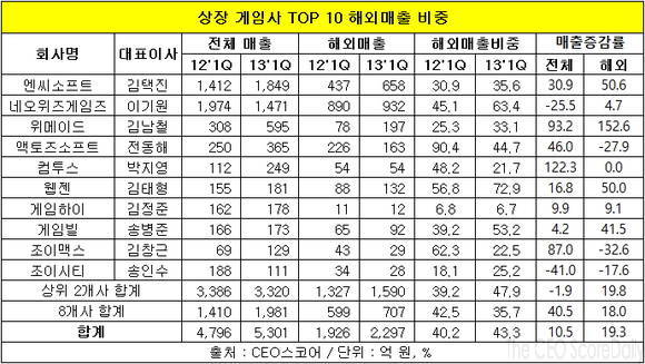 10대 게임사의 올 1분기 매출 가운데 63%, 해외매출 가운데 69%를 차지하고 있는 엔씨소프트(대표 김택진)와 네오위즈게임즈(대표 이기원)가 해외매출 비중을 높이는 데 주도적인 역할을 했기 때문이다.
