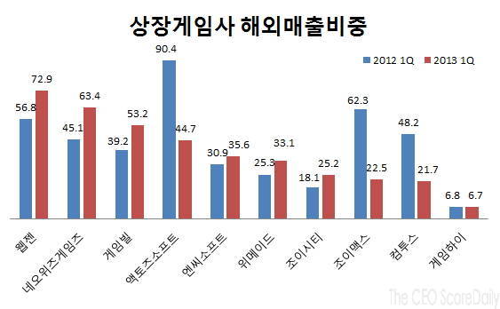 업체별로는 웹젠(대표 김태형)의 해외매출 비중이 가장 높은 것으로 나타났다.