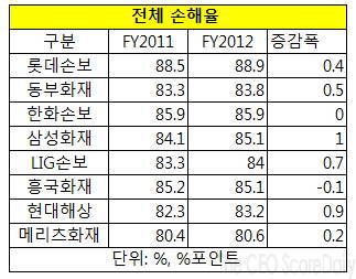 이어 동부화재(대표 김정남)는 70.9%, 롯데손보(대표 이봉철)는 65.9%, LIG손보(대표 김병헌)가 64.1%, 현대해상(대표 이철영 박찬종)이 63.8% 그 뒤를 이었다.