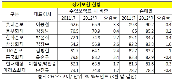 8개 손보사 중 장기보험 비중이 가장 낮은 삼성화재(대표 김창수)도 54.8%로 절반을 넘겼다.