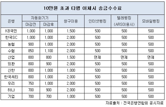 이밖에 농협은 900원, 수협은 850원, 산업은행과 외환은행, 신한은행, 한국씨티은행은 각각 800원을 내야 한다. 우리은행은 750원, 기업은행과 하나은행은 700원으로 11개 은행 중 가장 저렴했다.
