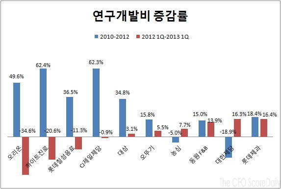 11일 재벌 및 CEO 기업경영성과 평가사이트인 CEO스코어(대표 박주근)에 따르면 올해 1분기에 국내 10대 상장 식품업체가 지출한 연구개발비는 443억5천100만 원으로 지난해 1분기보다 0.8% 증가에 그친 것으로 집계됐다.