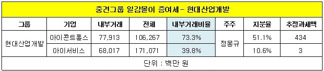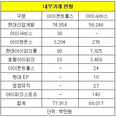 아이콘트롤스(대표 이창우)의 경우 지난해 총 매출 1천62억 원 가운데 내부거래비율이 73%에 달했고, 아이서비스(대표 현계흥)는 1천710억 원 중 39%를 기록했다.
