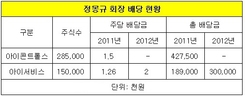 정 회장은 지난 2011년 아이콘롤스에서 주당 1천500원 씩 4억2천만 원을 배당받았고, 아이서비스에서는 2010년과 2011년에 각각 1억8천만 원과 3억 원을 배당받았다.